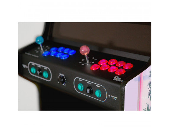 Que vous souhaitiez jouer en solo ou affronter vos amis, vous pourrez jouer avec des manettes et boutons japonais Roses vs Bleus. Ces derniers se marient à merveille avec le style city pop japonais aux couleurs de Miami Vice. Le look de cette Borne d’Arcade Miami Palm Monnayeur plaira forcément aux plus nostalgiques ainsi qu’aux amateurs de rétro Gaming.
