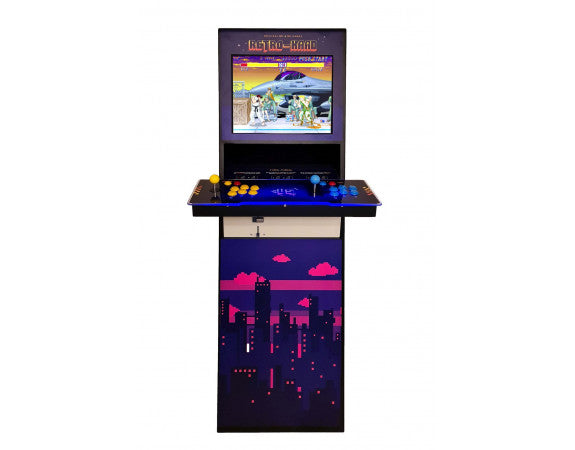 Un autre avantage de cette Borne Arcade retro Kaad, il s’agit certainement de son look rétro et vintage et qui plaira forcément aux plus nostalgiques ainsi qu’aux amateurs de rétro gaming. Ces motifs grattes ciels de couleur violette et nuage roses reprennent l’esprit de la culture pop japonaise. Ce design a été réalisé par un artiste français.